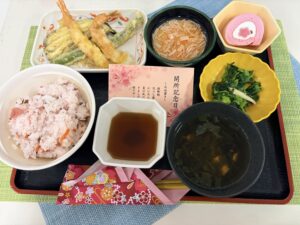 ・桜ご飯 ・天ぷら盛合せ ・かにあん茶碗蒸し ・菜の花の辛し和え ・すまし汁 ・桜のロールケーキ